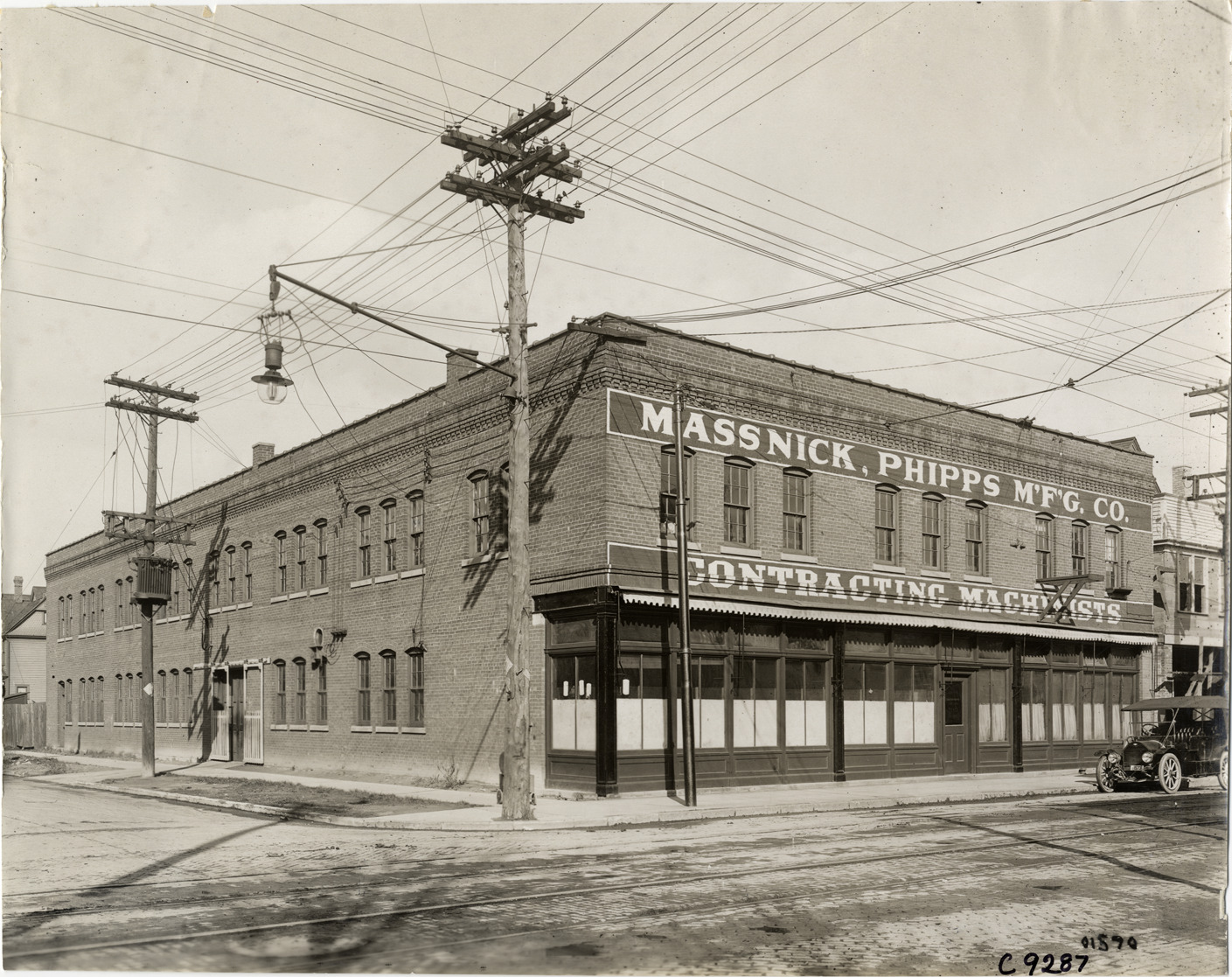 Favorite this☆ Massnick-Phipps Manufacturing Company factory Description: View of Massnick-Phipps Manufacturing Company factory. Sign on building: "Massnick, Phipps M'f'g. Co. contracting machinists." Handwritten on back: "Factories--Massnick-Phipps Mfg. Co., 1910." Details Resource ID: na007215 Subject: Factories Automobile industry and trade Photographic prints Date Issued: 1910 Format: 1 photographic print ; 7.5 x 9.5 in. Member of: National Automotive History Collection Lazarnick Collection Filing Location: Factories--Massnick-Phipps Mfg. Co. Negative Number: Negative #C9287 Rights: Physical rights are retained by DPL. Copyright is retained in accordance with U.S. copyright laws.