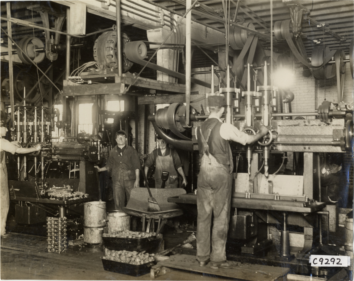 Favorite this☆ Workers at machines in Massnick-Phipps Manufacturing Company factory Description: View of men operating machines at Massnick-Phipps Manufacturing Company factory. Handwritten on back: "Factories--Massnick-Phipps Mfg. Co., 1910." Details Resource ID: na007220 Subject: Factories Machinists Machinery Photographic prints Date Issued: 1910 Format: 1 photographic print ; 7.5 x 9.5 in. Member of: National Automotive History Collection Lazarnick Collection Filing Location: Factories--Massnick-Phipps Mfg. Co. Negative Number: Negative #C9292 Rights: Physical rights are retained by DPL. Copyright is retained in accordance with U.S. copyright laws.