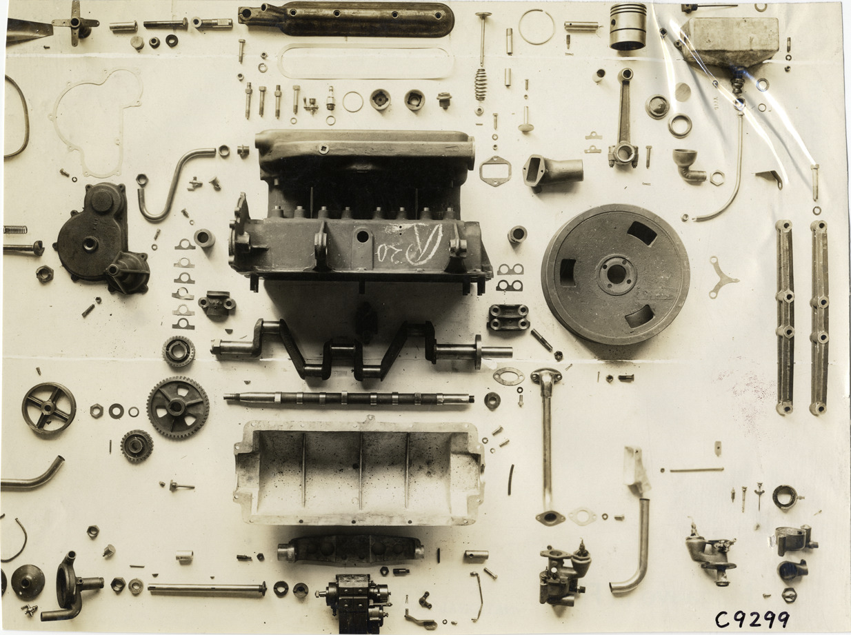View of display of car parts manufactured by Metzger Motor Car Company factory. Handwritten on back: "Factories--Metzger Motor Car Co., 1911. Everitt."