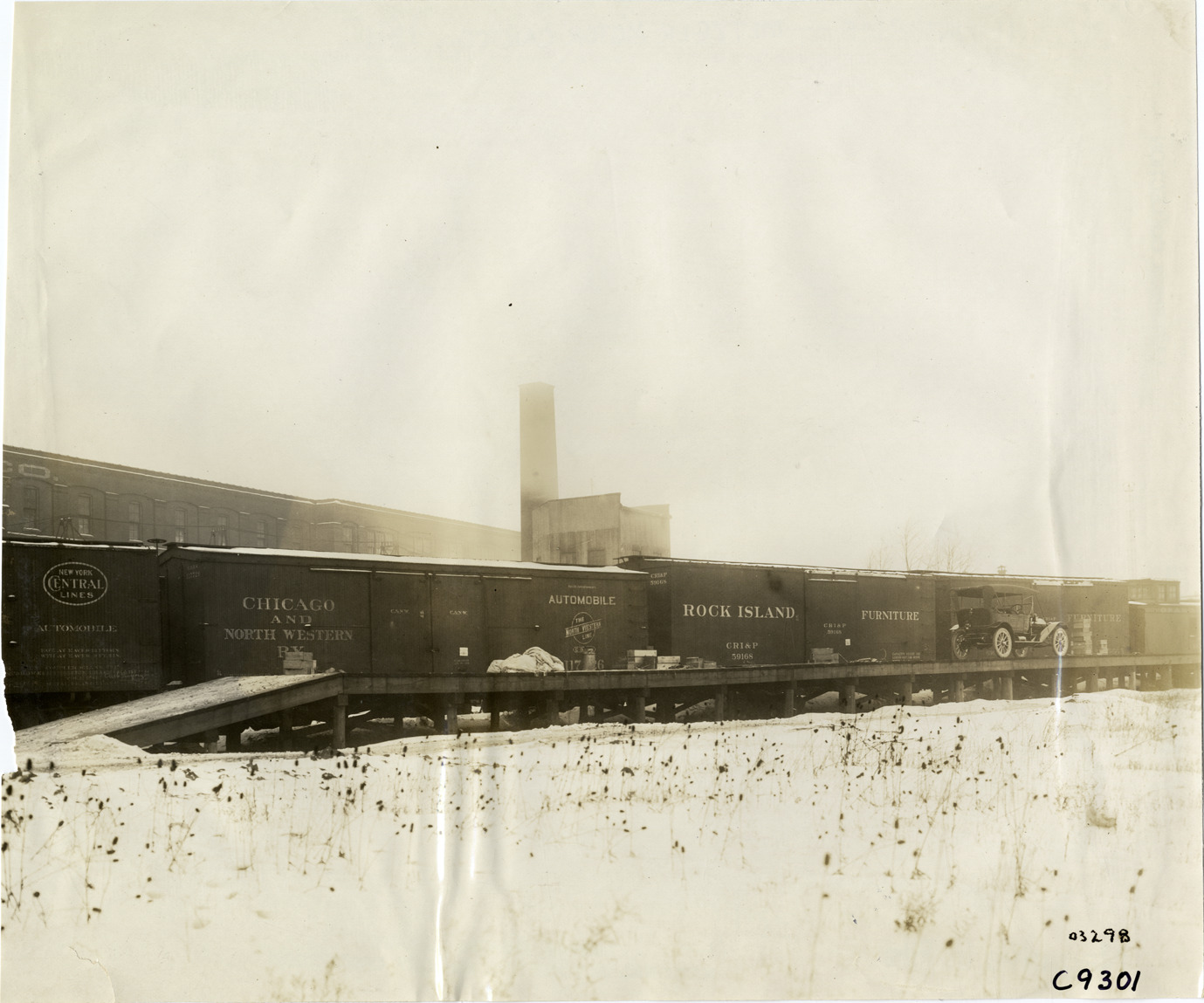 View of Everitt car on platform in front of railroad cars. Handwritten on back: "Factories--Metzger Motor Car Co., 1911. Everitt."