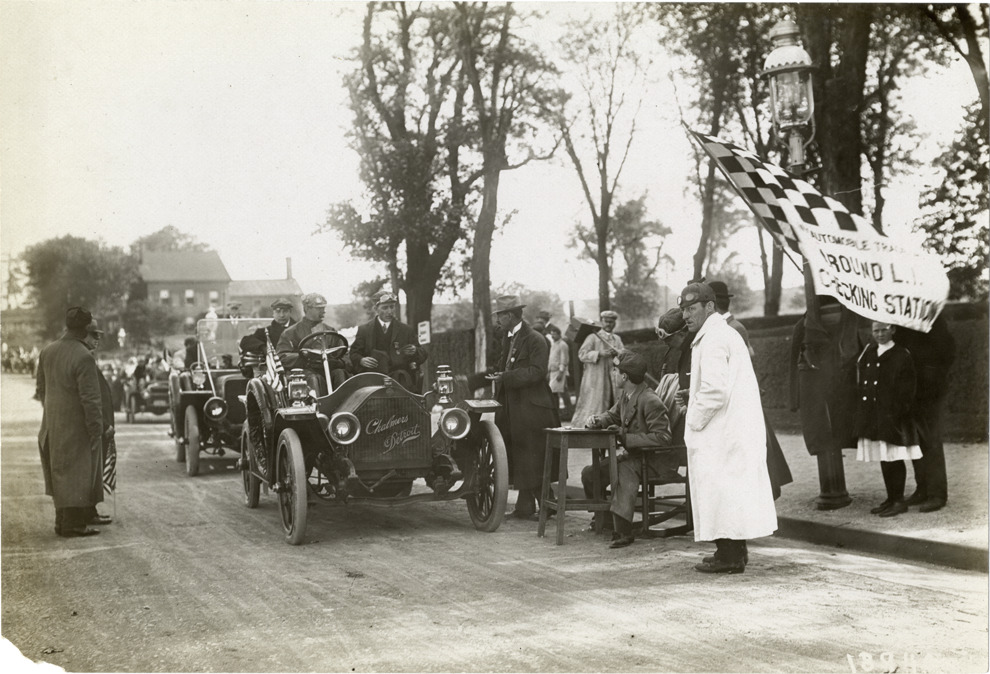 Motorists in Chalmers-Detroit automobile approaching checkpoint for Around Long Island Tour