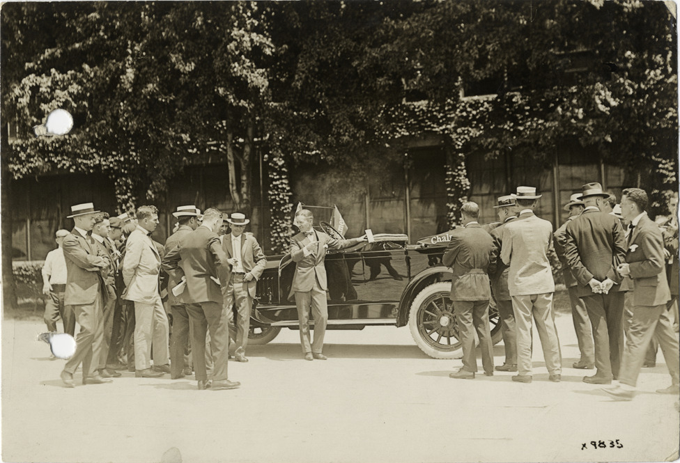Favorite this☆ Man showing Chalmers automobile to audience Description: View of man showing Chalmers car to group of men. Ivy-covered building in background. Handwritten on back: "Chalmers, c.1910. Chalmers-Detroit." Details Resource ID: na007246 Subject: Automobiles Chalmers Motor Company Chalmers-Detroit Motor Company Photographic prints Date Issued: 1910 (year approximate) Format: 1 photographic print mounted on fabric ; 4.5 x 6.5 in. Member of: National Automotive History Collection Lazarnick Collection Filing Location: Chalmers Rights: Physical rights are retained by DPL. Copyright is retained in accordance with U.S. copyright laws.