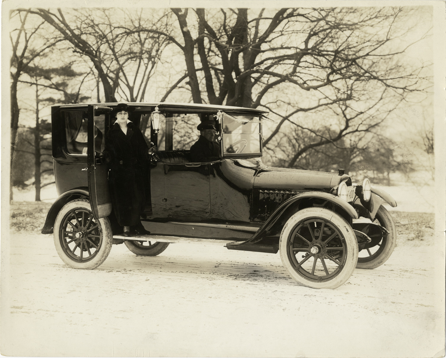 View of woman standing on running board of 1920 Chalmers car; driver in front seat. Stamped on back: "N. Lazarnick, photographic illustrations, 230 Park Avenue, New York Central Building, New York, N.Y. Tel. Vanderbilt 0011-12-13-14-15." Handwritten on back: "Chalmers, 1920."