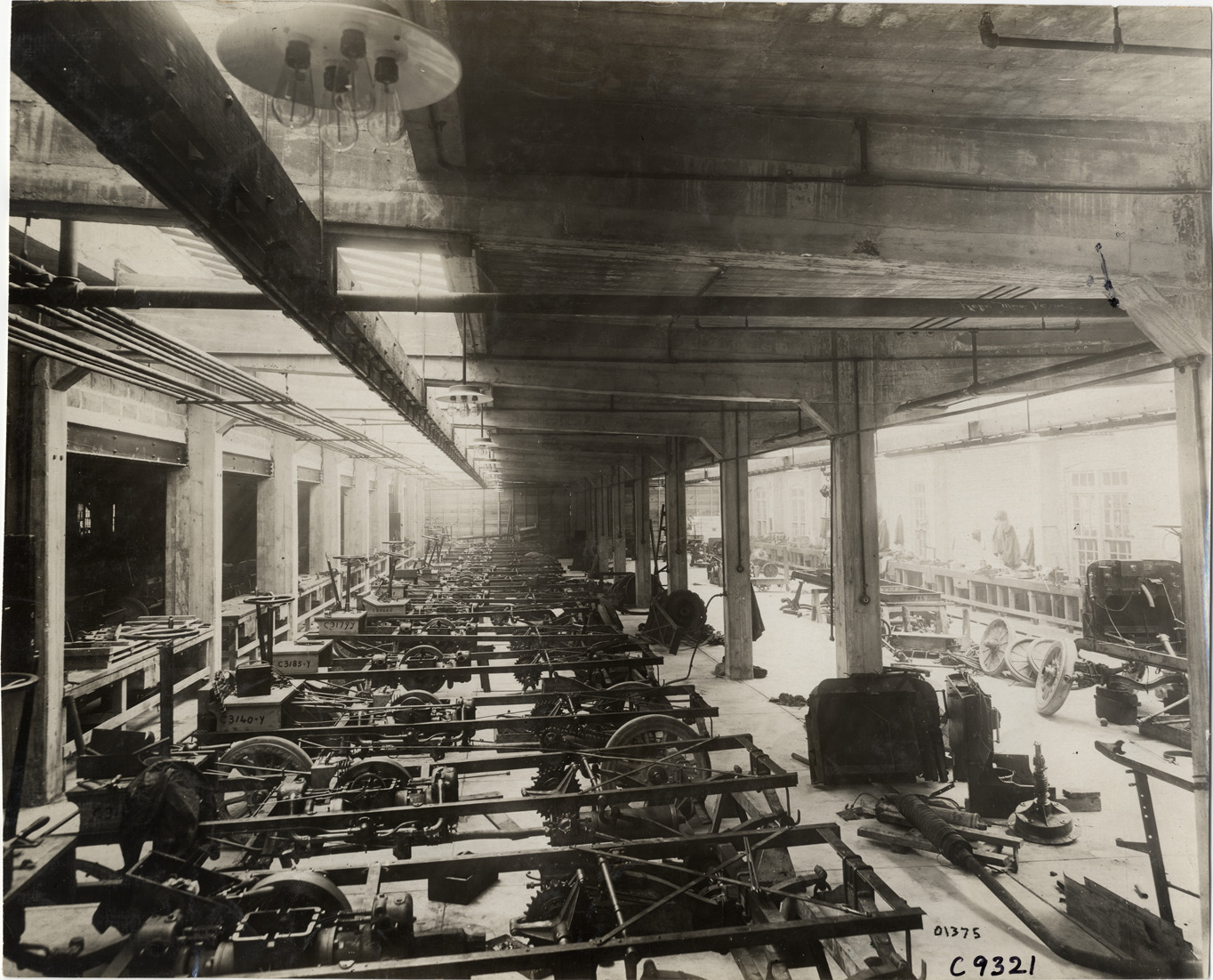 View of row of truck chassis at Rapid Motor Vehicle Company factory. Stamped on back: "Spooner & Wells, Inc., photographers, telephone North 1745. 1231 Woodward Ave., Detroit, Mich. Detroit, 1231 Woodward, New York, 1931 Broadway." Handwritten on back: "Factories--Rapid Motor Vehicle Co., 1910."