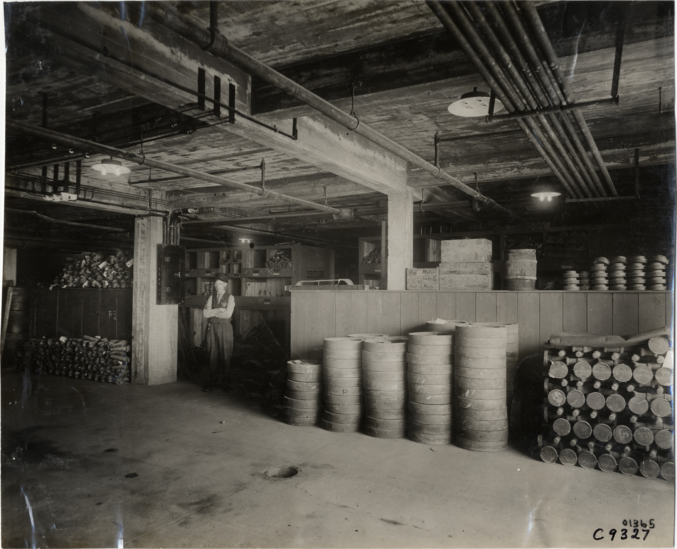 View of man in storeroom with stacks of motor vehicle parts at Rapid Motor Vehicle Company factory. Stamped on back: "Spooner & Wells, Inc., photographers, telephone North 1745. 1231 Woodward Ave., Detroit, Mich. Detroit, 1231 Woodward, New York, 1931 Broadway." Handwritten on back: "Factories--Rapid Motor Vehicle Co., 1910."