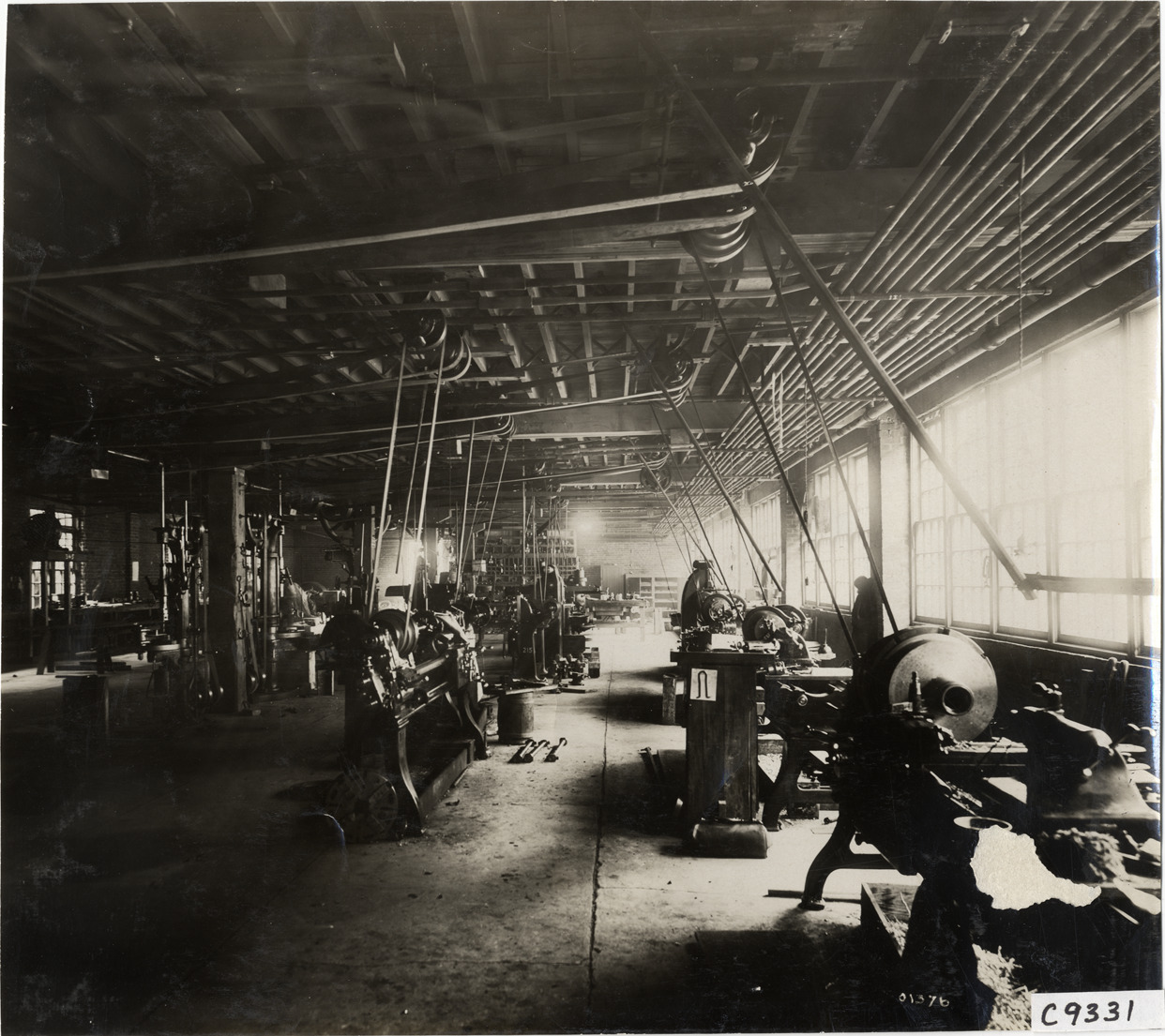 View of machinery in Rapid Motor Vehicle Company factory. Stamped on back: "Spooner & Wells, Inc., photographers, telephone North 1745. 1231 Woodward Ave., Detroit, Mich. Detroit, 1231 Woodward, New York, 1931 Broadway." Handwritten on back: "Factories--Rapid Motor Vehicle Co., 1910."