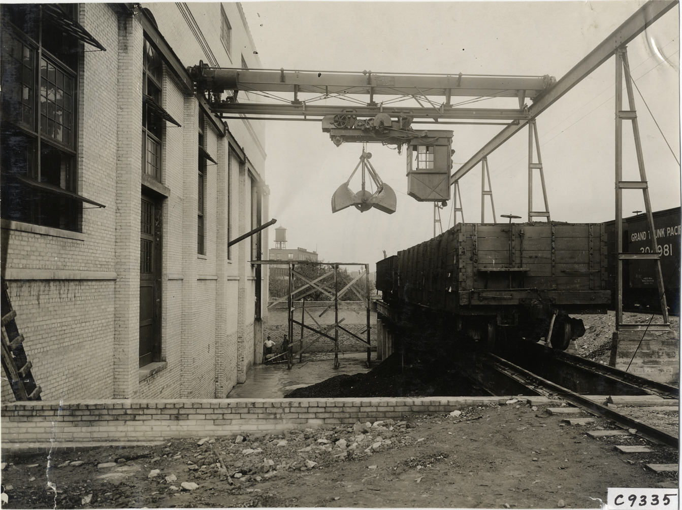 View of worker in cab operating clamshell bucket which unloads coal from railroad freight car at Rapid Motor Vehicle Company factory. Bucket is suspended from overhead track. Stamped on back: "Spooner & Wells, Inc., photographers, telephone North 1745. 1231 Woodward Ave., Detroit, Mich. Detroit, 1231 Woodward, New York, 1931 Broadway." Handwritten on back: "Factories--Rapid Motor Vehicle Co., 1910."