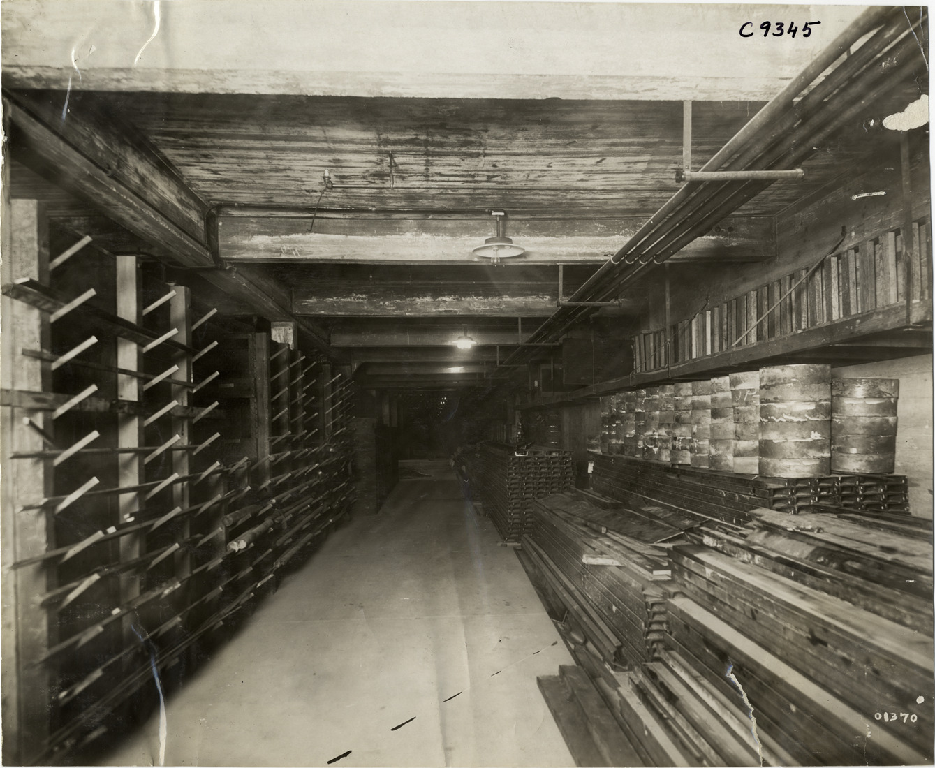 View of interior of Rapid Motor Vehicle Company factory. Beams stacked along wall and on racks. Stamped on back: "Spooner & Wells, Inc., photographers, telephone North 1745. 1231 Woodward Ave., Detroit, Mich. Detroit, 1231 Woodward, New York, 1931 Broadway." Handwritten on back: "Factories--Rapid Motor Vehicle Co., 1910."