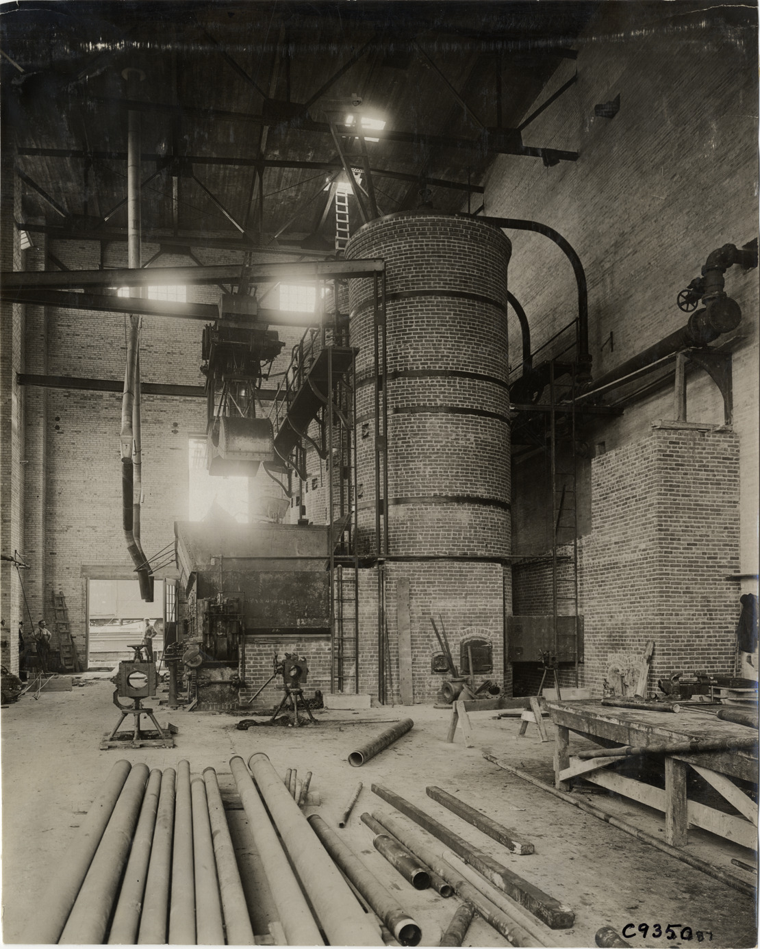 View of brick coal-fired furnace for boiler at Rapid Motor Vehicle Company factory. Clamshell bucket suspended over hopper; lengths of pipe in foreground. Stamped on back: "Spooner & Wells, Inc., photographers, telephone North 1745. 1231 Woodward Ave., Detroit, Mich. Detroit, 1231 Woodward, New York, 1931 Broadway." Handwritten on back: "Factories--Rapid Motor Vehicle Co., 1910."