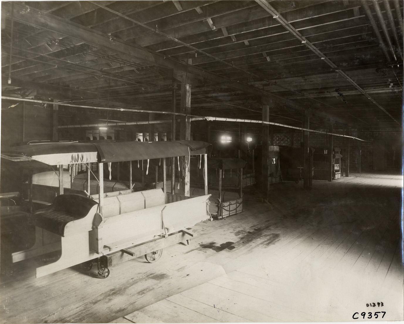 View of automobile bodies inside Rapid Motor Vehicle Company factory. Stamped on back: "Spooner & Wells, Inc., photographers, telephone North 1745. 1231 Woodward Ave., Detroit, Mich. Detroit, 1231 Woodward, New York, 1931 Broadway." Handwritten on back: "Factories--Rapid Motor Vehicle Co., 1910."