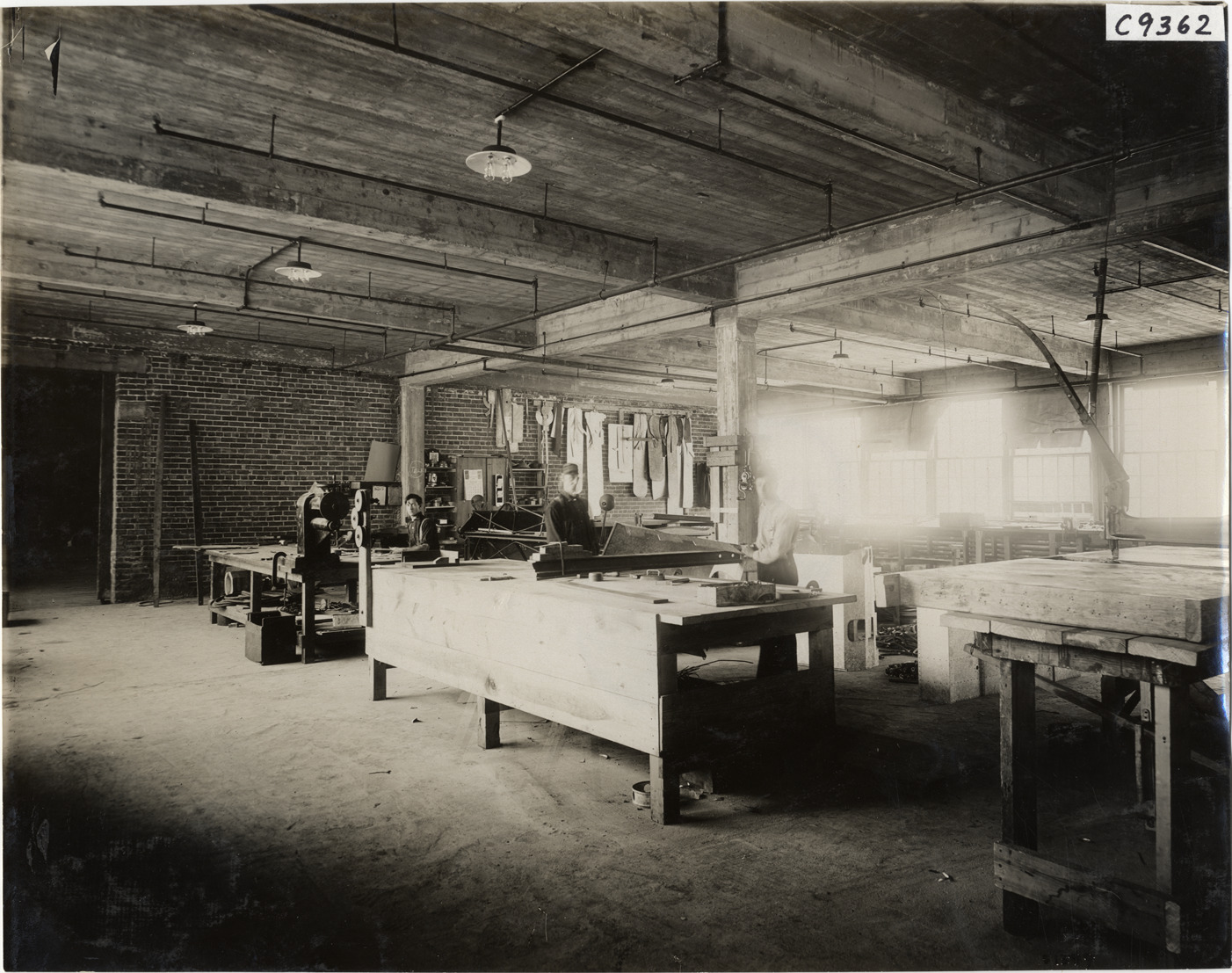 View of men working in Rapid Motor Vehicle Company factory. Workbenches in foreground. Stamped on back: "Spooner & Wells, Inc., photographers, telephone North 1745. 1231 Woodward Ave., Detroit, Mich. Detroit, 1231 Woodward, New York, 1931 Broadway." Handwritten on back: "Factories--Rapid Motor Vehicle Co., 1910."