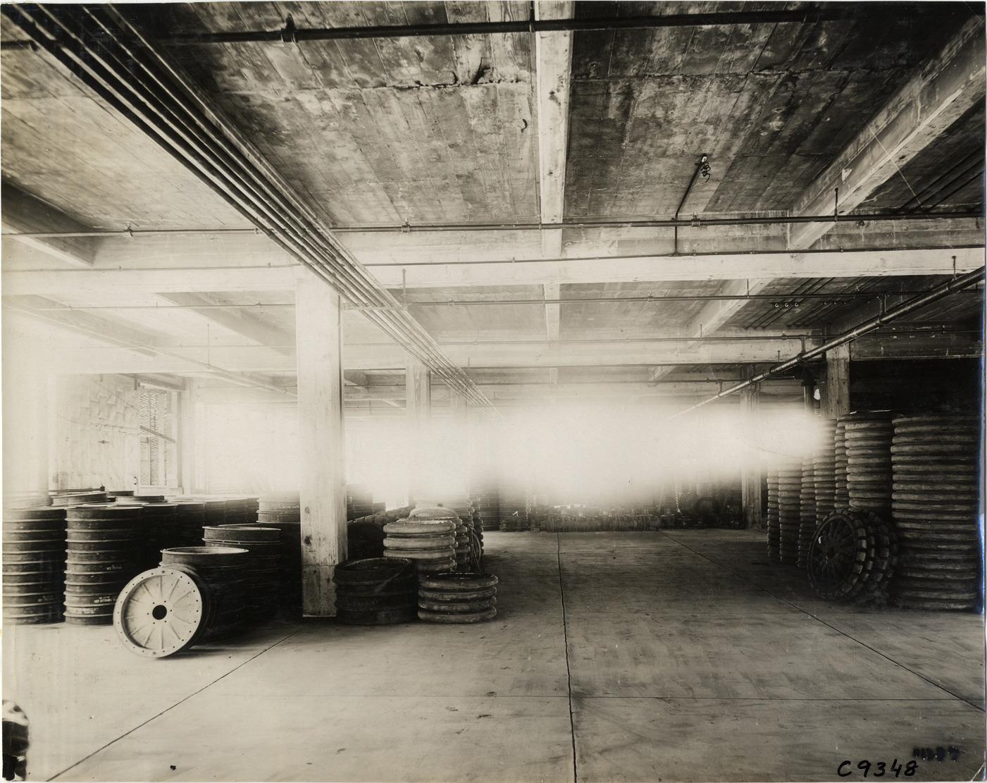 View of motor vehicle wheels stacked in room at Rapid Motor Vehicle Company factory. Stamped on back: "Spooner & Wells, Inc., photographers, telephone North 1745. 1231 Woodward Ave., Detroit, Mich. Detroit, 1231 Woodward, New York, 1931 Broadway." Handwritten on back: "Factories--Rapid Motor Vehicle Co., 1910."
