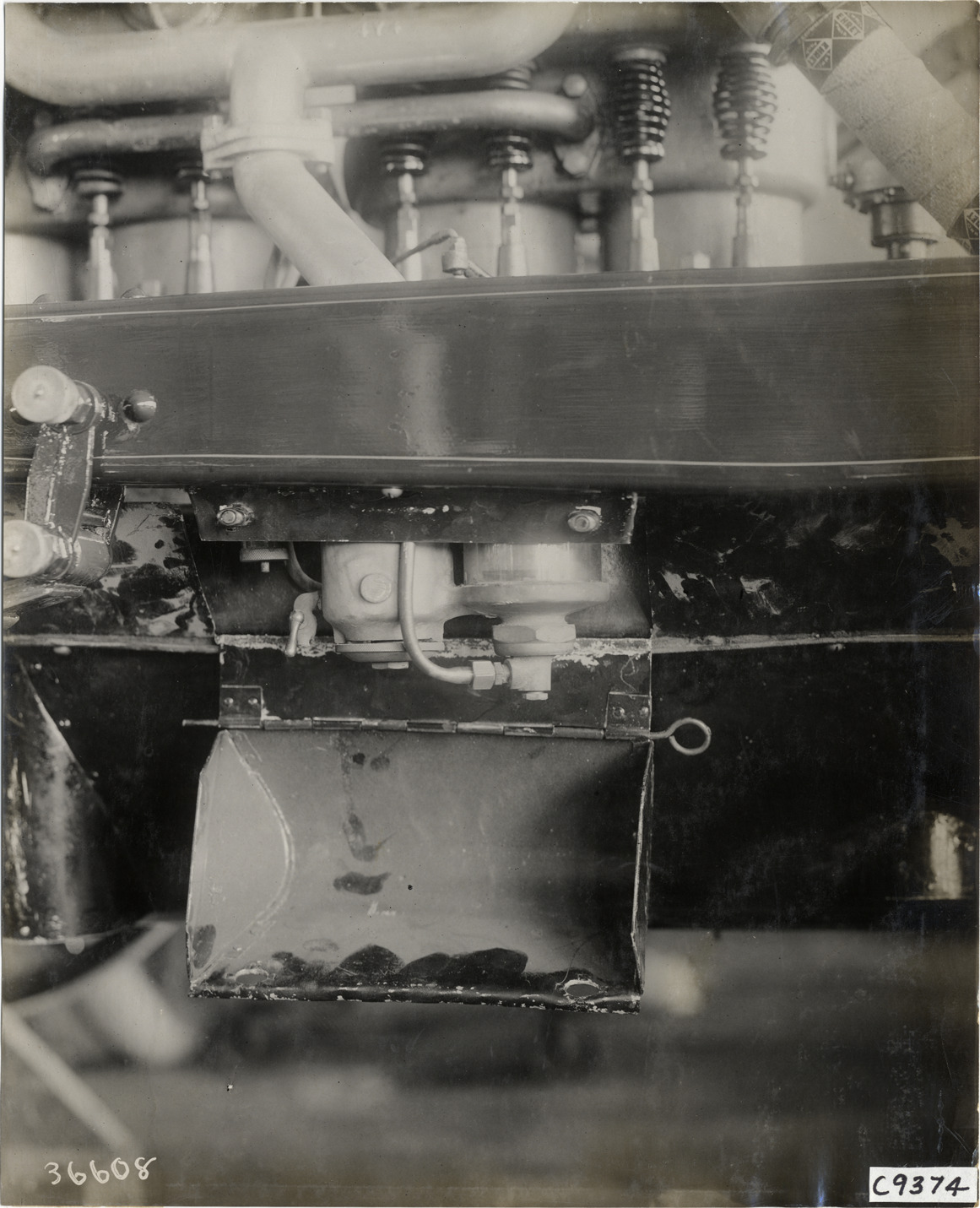 Close-up view of car engine manufactured by Selden Motor Vehicle Company. Stamped on back: "Spooner & Wells, Inc., photographers, telephones 3472-3473 Columbus, 1931 Broadway, New York." Handwritten on back: "Factories--Selden Motor Vehicle Company, 1910."