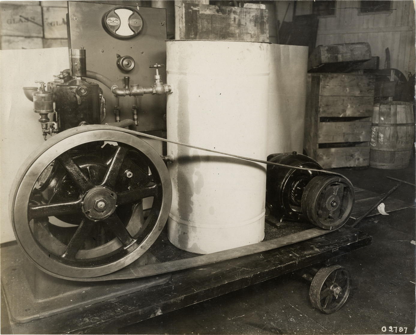 View of unidentified apparatus at Charles A. Strelinger Company factory. Stamped on back: "Spooner & Wells, Inc., photographers, 1231 Woodward Ave., Detroit, Mich., telephone North 1745." Handwritten on back: "Factories--Strelinger (Charles A.) Co., 1911."