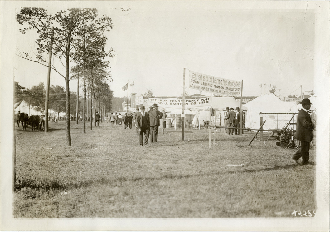 View of fairgoers viewing exhibits at Michigan State Fair. Sign in background reads: "The iron truss fence post. W.J. Burton Co., Detroit." Stamped on back: "Spooner & Wells, Inc., photographers, telephone North 1745. 1231 Woodward Ave., Detroit, Mich. Detroit, 1231 Woodward, New York, 1931 Broadway." Handwritten on back: "Fairs--Michigan State Fair, 1910."