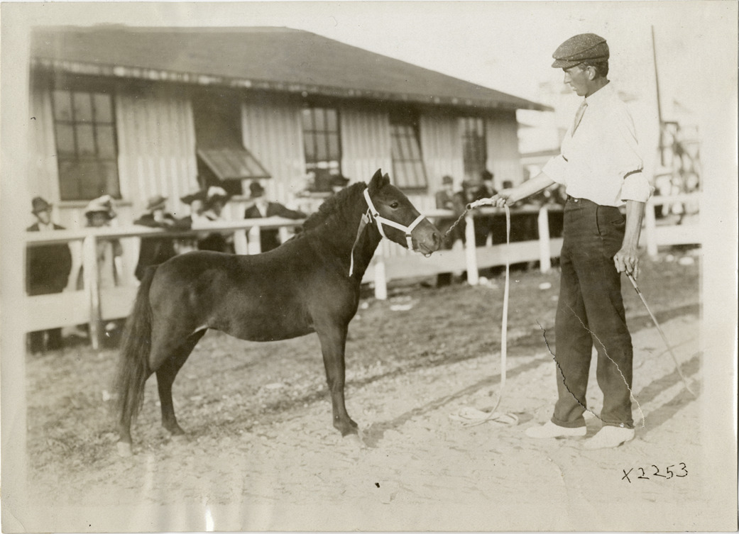 View of man exhibiting one-year old horse, or yearling, at Michigan State Fair. Stamped on back: "Spooner & Wells, Inc., photographers, telephone North 1745. 1231 Woodward Ave., Detroit, Mich. Detroit, 1231 Woodward, New York, 1931 Broadway." Handwritten on back: "Fairs--Michigan State Fair, 1910. Mildred Harum, winner first place, one year old class, four state fairs."