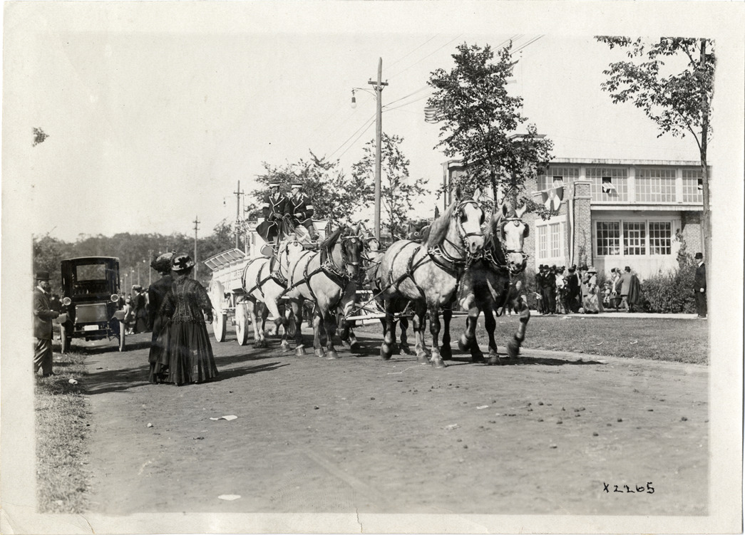 Favorite this☆ Draft horses pulling wagon, Michigan State Fair Description: View of two men driving wagon pulled by draft horses at Michigan State Fair. Two women stand on roadside. Handwritten on back: "Fairs--Michigan State Fair, 1910." Details Resource ID: na007386 Subject: Draft horses--Michigan--Detroit Horse-drawn vehicles--Michigan--Detroit Michigan State Fair Photographic prints Date Issued: 1910 Format: 1 photographic print ; 5 x 7 in. Member of: National Automotive History Collection Lazarnick Collection Filing Location: Fairs--Michigan State Fair, 1910 #2 Rights: Physical rights are retained by DPL. Copyright is retained in accordance with U.S. copyright laws.