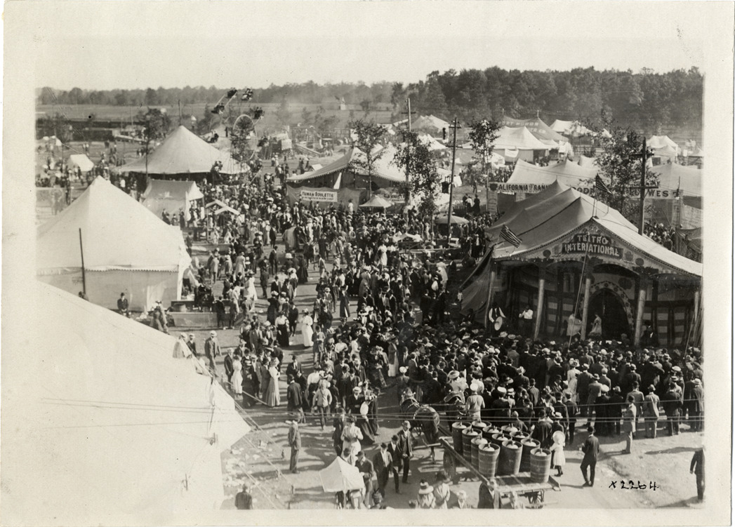 Crowd on midway at Michigan State Fair Description: Bird's-eye view of crowd on midway at Michigan State Fair. Tent for Teatro International in foreground; ferris wheel in background. Handwritten on back: "Fairs--Michigan State Fair, 1910." Details Resource ID: na007387 Subject: Midways--Michigan--Detroit Crowds--Michigan--Detroit Michigan State Fair Photographic prints Date Issued: 1910 Format: 1 photographic print ; 5 x 7 in. Member of: National Automotive History Collection Lazarnick Collection Filing Location: Fairs--Michigan State Fair, 1910 #2 Rights: Physical rights are retained by DPL. Copyright is retained in accordance with U.S. copyright laws.
