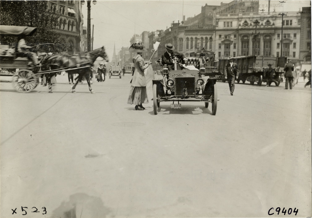 Favorite this☆ Motorist driving 1907-1908 Ford automobile Description: View of man driving a 1907 or 1908 Ford Model R or S car on street; woman stands next to car. Detroit Opera House and horse-drawn carriage in background. Handwritten on back: "Ford, 1910." Details Resource ID: na007456 Subject: Ford automobile Photographic prints Date Issued: 1910 Format: 1 photographic print ; 4.75 x 6.75 in. Member of: National Automotive History Collection Lazarnick Collection Filing Location: Ford Negative Number: C9404 Rights: Physical rights are retained by DPL. Copyright is retained in accordance with U.S. copyright laws.