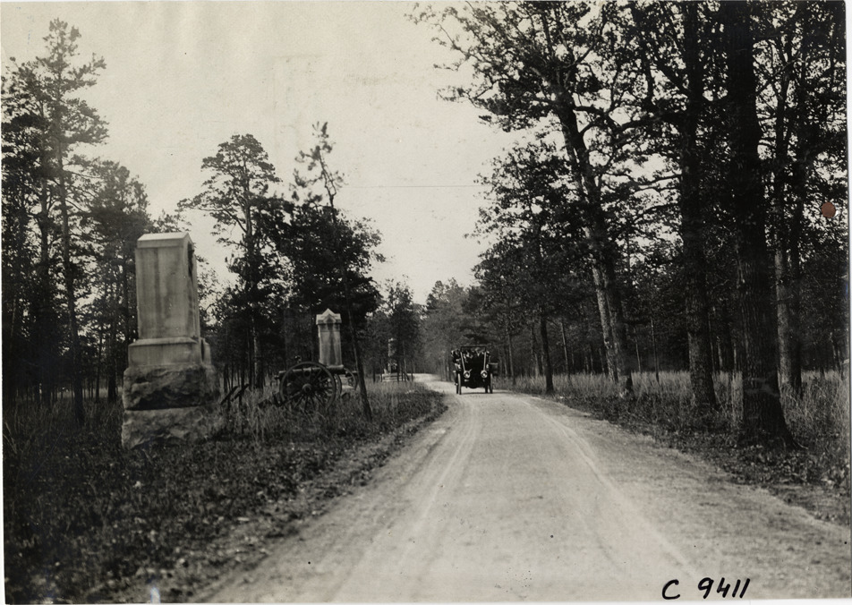 View of motorists traveling on rural road in 1909 Franklin car. Cannon and stone monuments, probably a Civil War monument, on side of dirt road. Stamped on back: "Spooner & Wells, Inc., photographers, telephones 3472-3473 Columbus, 1931 Broadway, New York." Handwritten on back: "Franklin, 1909."