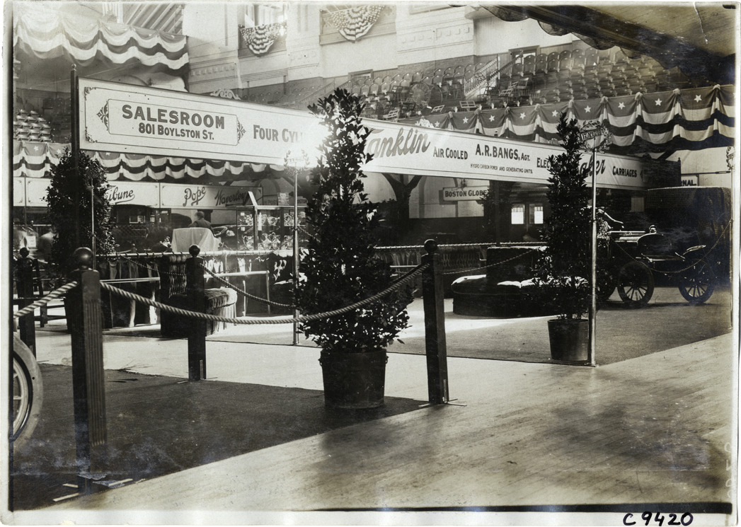 View of 1905 Franklin car in display at trade show. Room is decorated with plants and bunting; sign over display reads: "Four cylinder Franklin air cooled, salesroom, 801 Boyleston St., A.R. Bangs, Agt." Handwritten on back: "Franklin, 1905."