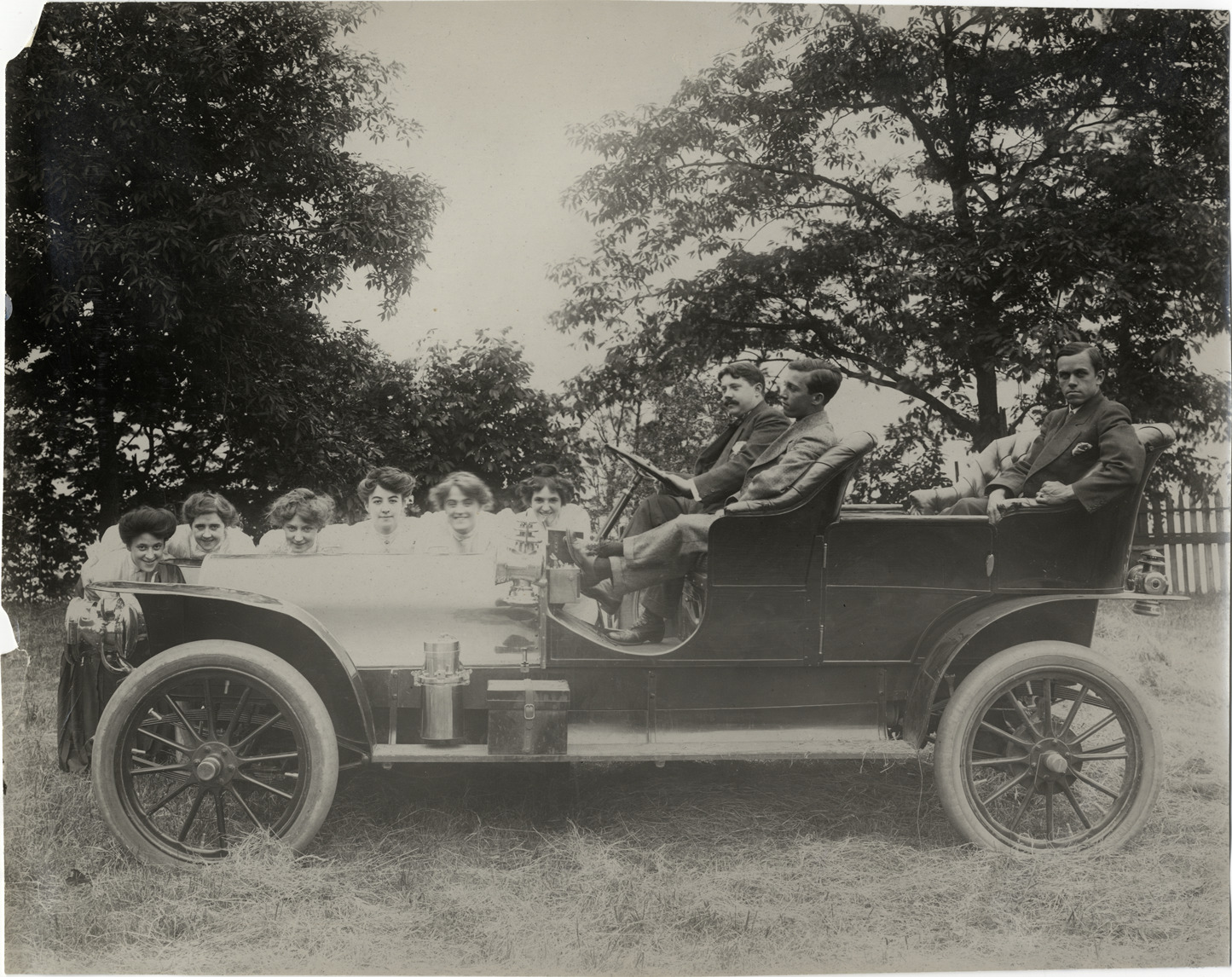 Favorite this☆ Young men and women with 1906 Franklin automobile Description: View of young men and women posing with 1906 Franklin car; women gather behind hood of car. Handwritten on back: "Franklin, 1906." Details Resource ID: na007504 Subject: Franklin automobile Young adults Photographic prints Date Issued: Unknown year Format: 1 photographic print ; 7.75 x 9.75 in. Member of: National Automotive History Collection Lazarnick Collection Filing Location: Franklin #2 Rights: Physical rights are retained by DPL. Copyright is retained in accordance with U.S. copyright laws.
