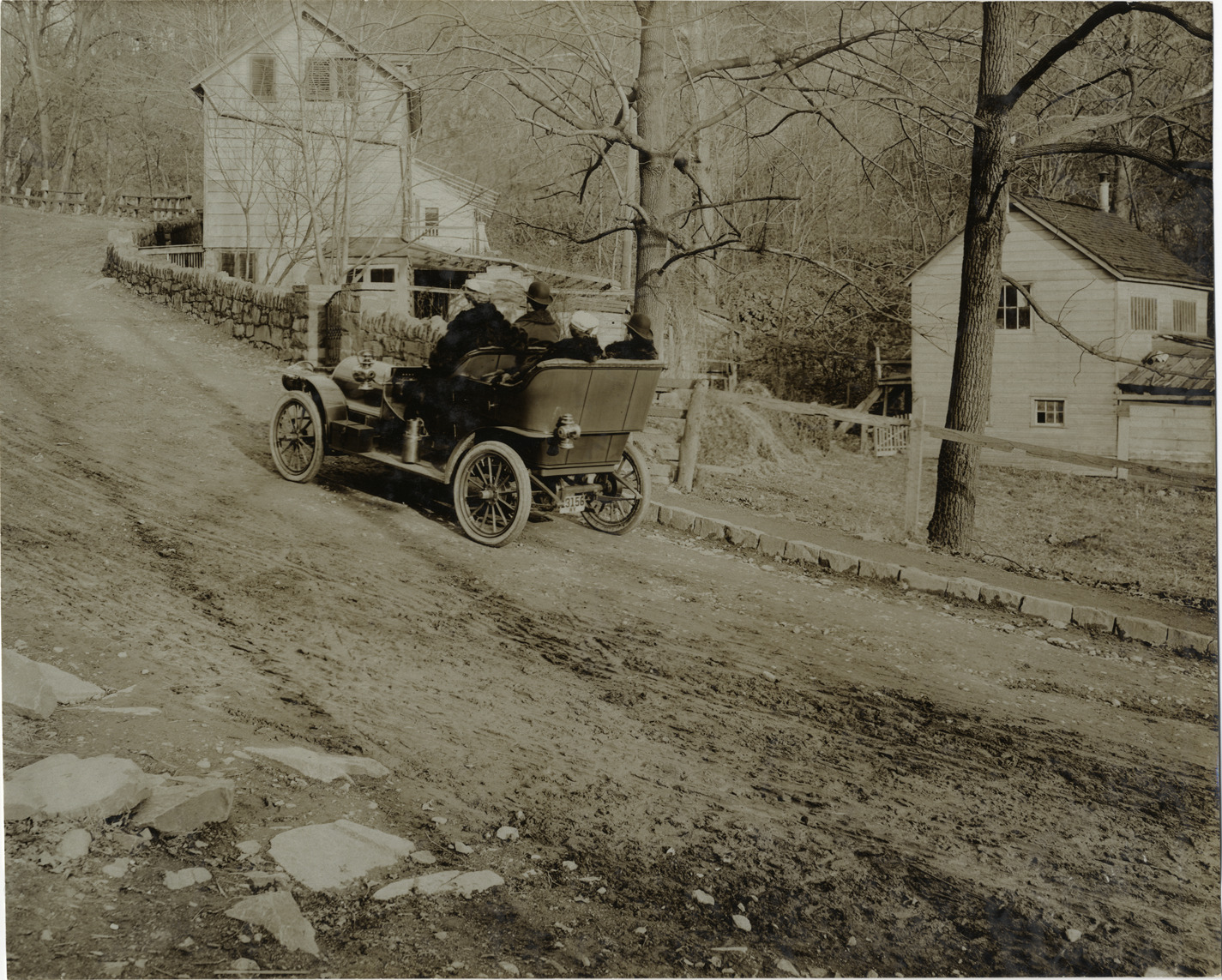 View of motorists in 1906 Franklin car, traveling on rural dirt road. Houses and stone walls on side of road. Stamped on back: "Photo by F. Ed. Spooner, 1536 B'way, telephone 6536-38th St., New York, N.Y." Handwritten on back: "Franklin, 1906."
