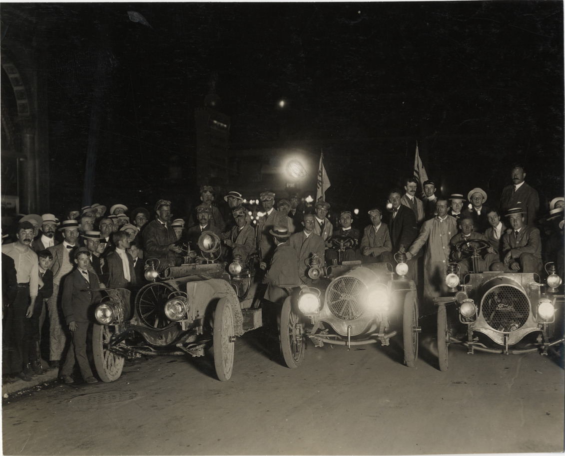 Favorite this☆ Motorists in 1907 Franklin automobiles at night Description: Nighttime view of motorists in 1907 Franklin cars, parked in row, with headlights illuminated. Crowd stands behind cars. Handwritten on back: "Franklin, 1907." Details Resource ID: na007516 Subject: Franklin automobile Photographic prints Date Issued: Unknown year Format: 1 photographic print ; 6.25 x 7.5 in. Member of: National Automotive History Collection Lazarnick Collection Filing Location: Franklin #2 Rights: Physical rights are retained by DPL. Copyright is retained in accordance with U.S. copyright laws.