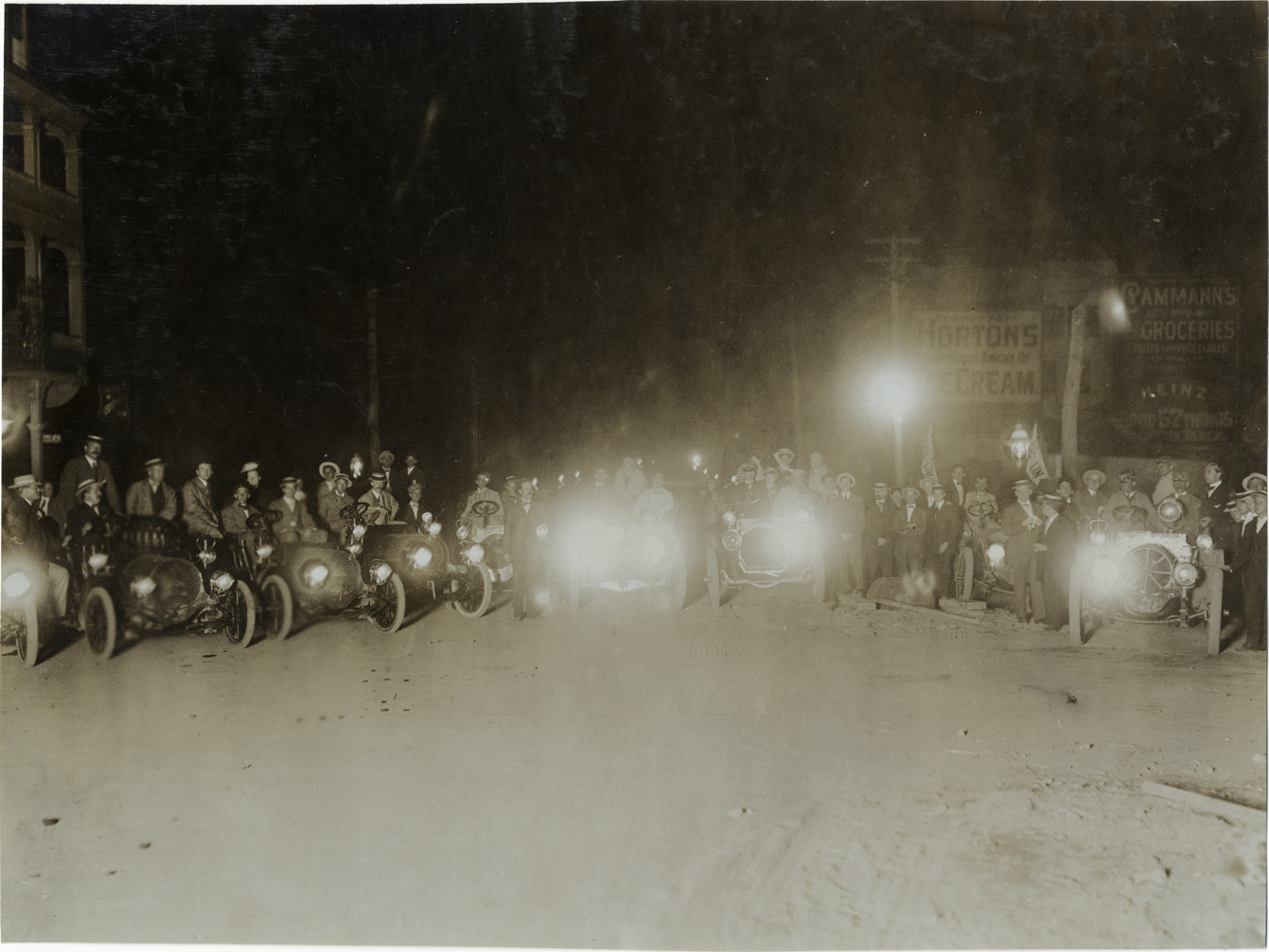 Favorite this☆ Motorists in 1907 Franklin automobiles at night Description: Nighttime view of motorists in 1907 Franklin cars, parked in row, with headlights illuminated. Crowd stands behind cars; buildings in background. Handwritten on back: "Franklin, 1907." Details Resource ID: na007517 Subject: Franklin automobile Photographic prints Date Issued: Unknown year Format: 1 photographic print ; 6.75 x 9 in. Member of: National Automotive History Collection Lazarnick Collection Filing Location: Franklin #2 Rights: Physical rights are retained by DPL. Copyright is retained in accordance with U.S. copyright laws.