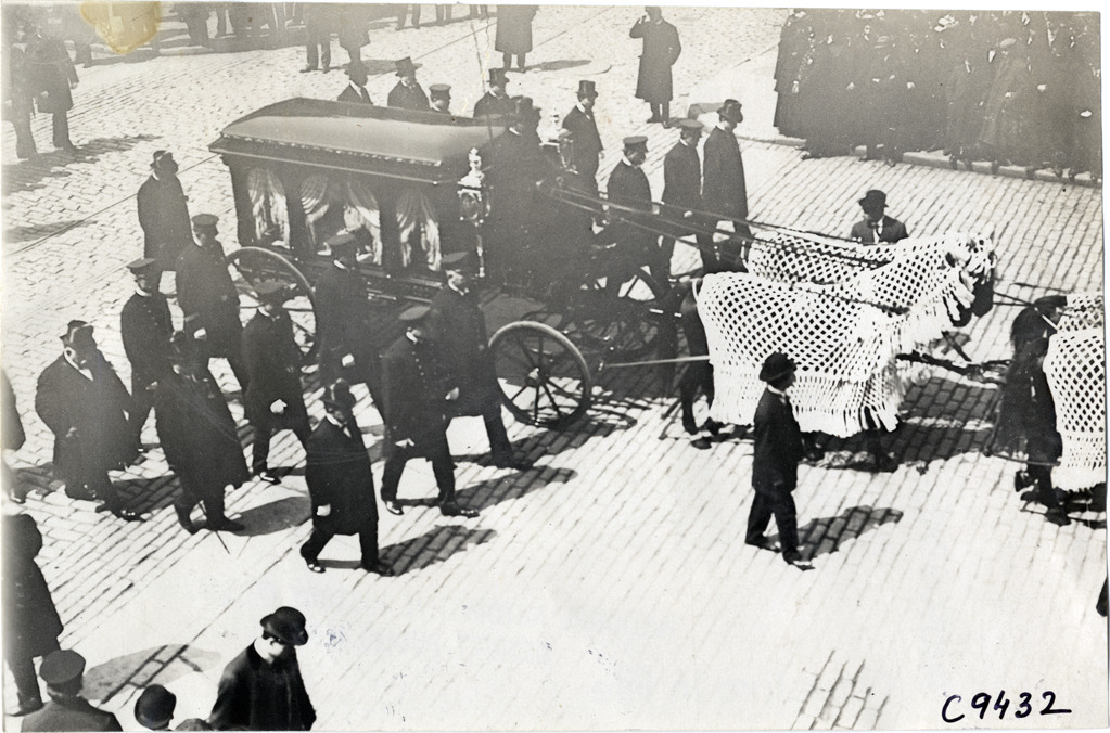 View of horse-drawn hearse at funeral of New York policeman Joseph Petrosino; police officers and mourners walk alongside hearse. Stamped on back: "Spooner & Wells, Inc., photographers, telephones 3472-3473 Columbus, 1931 Broadway, New York." Handwritten on back: "Funerals, 1909. Funeral of Joseph Petrosino."