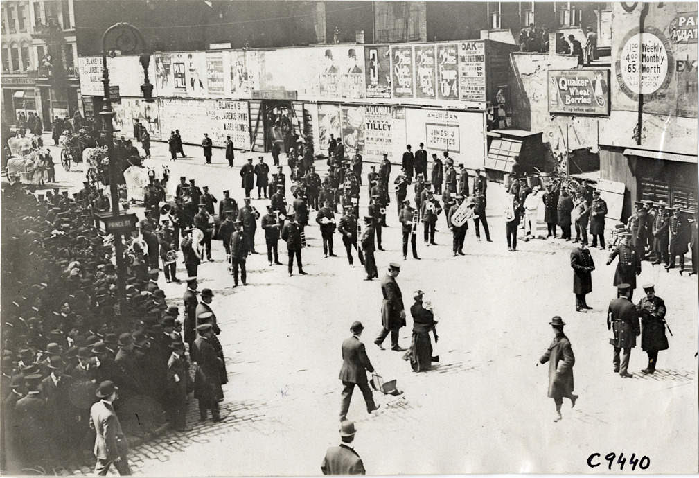 Favorite this☆ Police band, funeral of Joseph Petrosino Description: View of police band at funeral of New York policeman Joseph Petrosino. Handwritten on back: "Funerals, 1909. Funeral of Joseph Petrosino." Details Resource ID: na007551 Subject: Petrosino, Joe, 1860-1909--Death and burial Police--New York (State)--New York Bands (Music)--New York (State)--New York Funeral rites and ceremonies--New York (State)--New York Photographic prints Date Issued: 1909-04 Format: 1 photographic print ; 4.75 x 6.75 in. Member of: National Automotive History Collection Lazarnick Collection Filing Location: Funerals, 1909 Negative Number: Negative #C9440 Rights: Physical rights are retained by DPL. Copyright is retained in accordance with U.S. copyright laws.