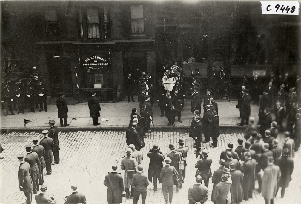 View of pallbears carrying coffin from building, possibly the clubrooms of the Republican League of the Third Assembly District at 233 Lafayette Street, at funeral of New York policeman Joseph Petrosino. Policemen stand at attention with rifles; crowd gathers nearby. Stamped on back: "Spooner & Wells, Inc., photographers, telephones 3472-3473 Columbus, 1931 Broadway, New York." Handwritten on back: "Funerals, 1909. Funeral of Joseph Petrosino."
