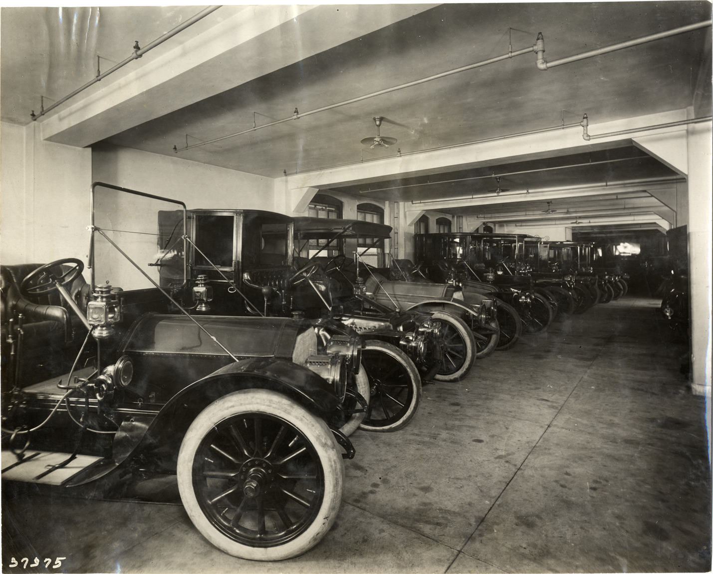 View of cars parked inside unidentified garage. Stamped on back: "Spooner & Wells, Inc., photographers, telephones 3472-3473 Columbus, 1931 Broadway, New York." Handwritten on back: "Garages, no I.D., 1910."
