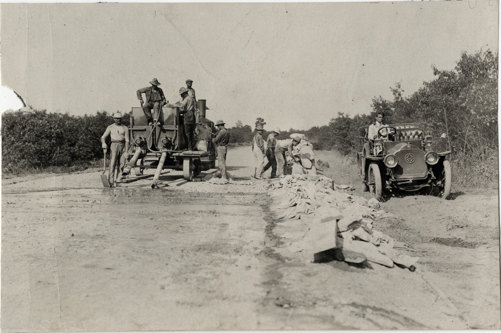Motorist traveling alongside road construction workers in 1908 Garford automobile