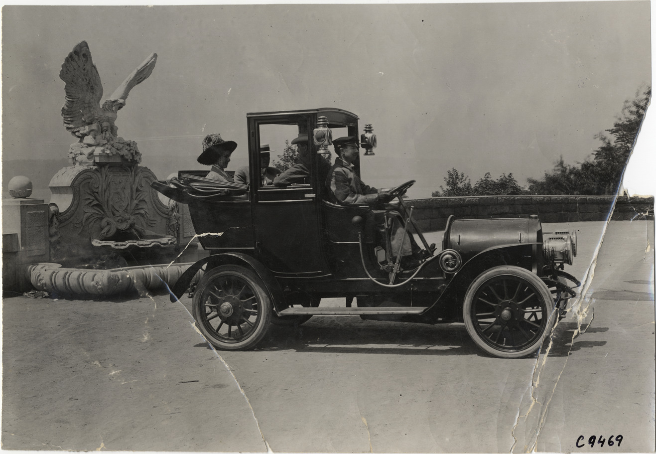 Favorite this☆ Motorists in 1908 Garford automobile Description: View of motorists in 1908 Garford car; eagle sculpture and fountain in background. Handwritten on back: "Garford, 1908." Details Resource ID: na007631 Subject: Automobiles Garford Company Fountains Photographic prints Date Issued: Unknown year Format: 1 photographic print ; 6 x 8.75 in. Member of: National Automotive History Collection Lazarnick Collection Filing Location: Garford, 1908 Negative Number: Negative #C9469 Rights: Physical rights are retained by DPL. Copyright is retained in accordance with U.S. copyright laws.