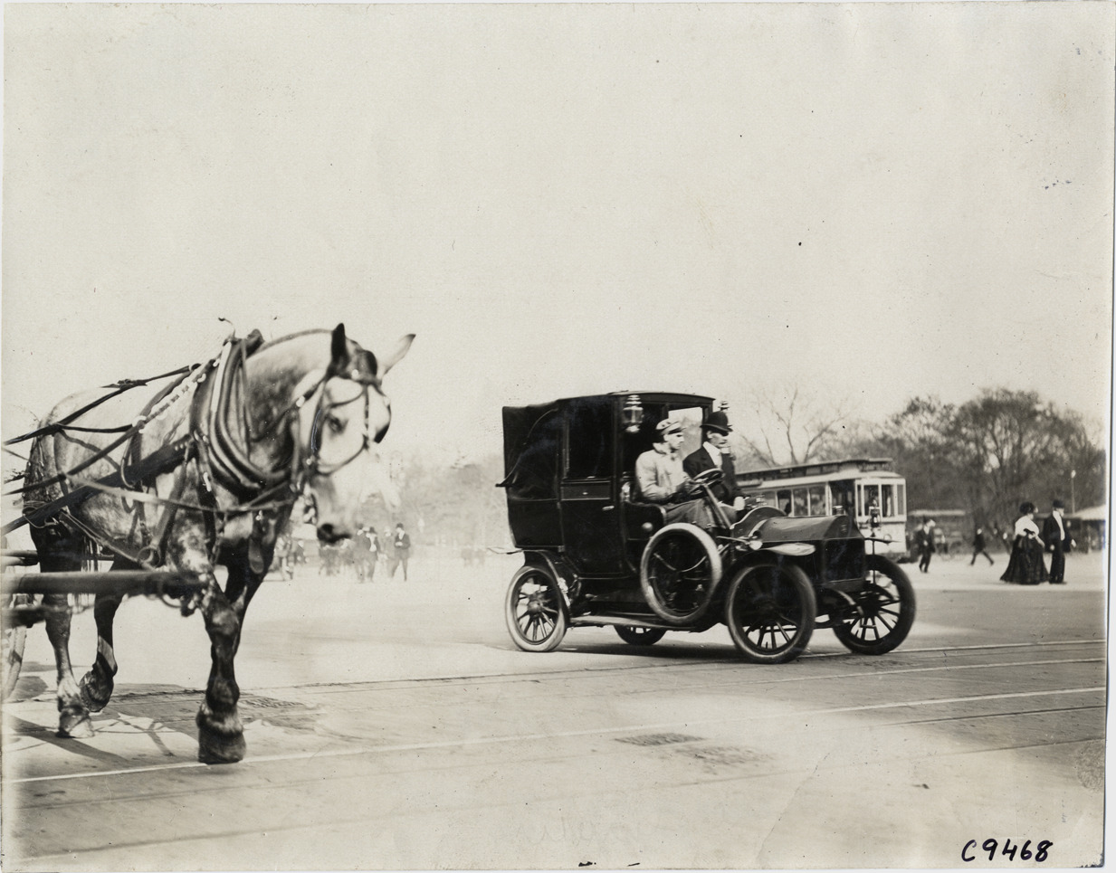 Favorite this☆ Motorists in 1908 Garford automobile Description: View of motorists in 1908 Garford car; horse in foreground. Handwritten on back: "Garford, 1908." Details Resource ID: na007632 Subject: Automobiles Horses Garford Company Photographic prints Date Issued: Unknown year Format: 1 photographic print ; 6 x 8.25 in. Member of: National Automotive History Collection Lazarnick Collection Filing Location: Garford, 1908 Negative Number: Negative #C9468 Rights: Physical rights are retained by DPL. Copyright is retained in accordance with U.S. copyright laws.