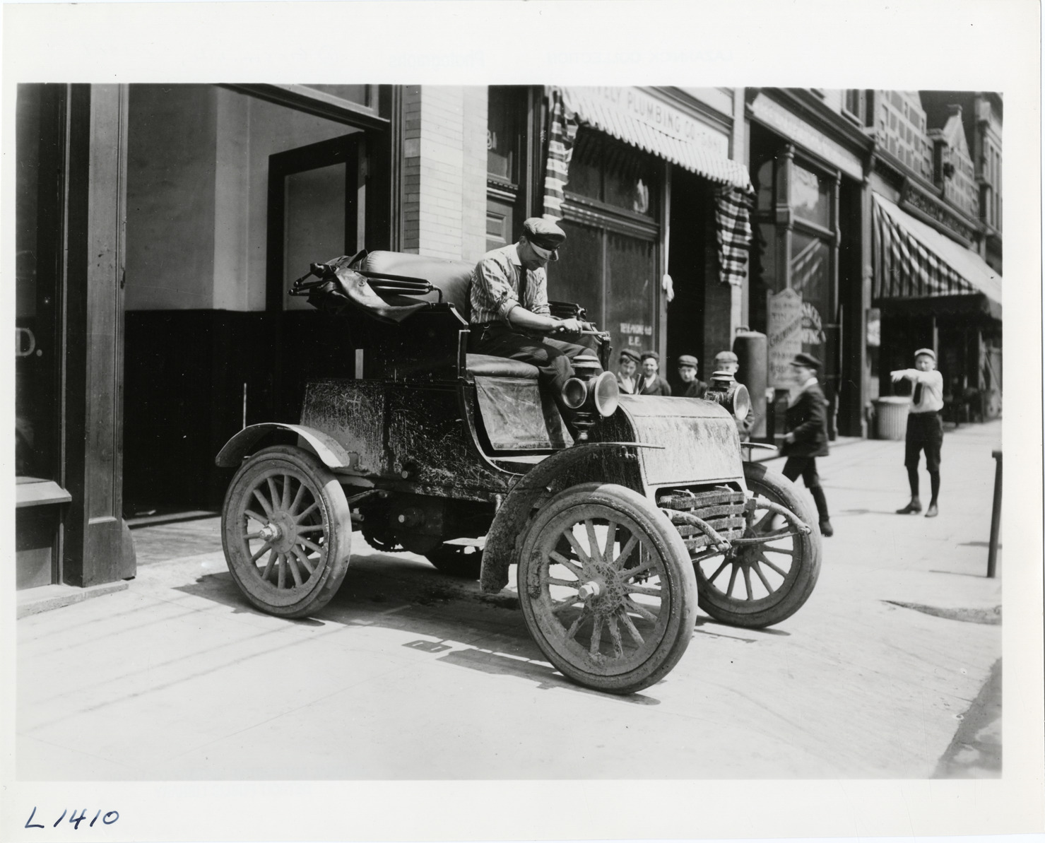View of driver in 1901 Gasmobile car, watched by group of boys on sidewalk. Typed on back: "The Gasmobile appeared in the 1900 New York Automobile Show. The company went out of business in 1902. This car was powered by two three-cylinder engines end to end with a common crankshaft developing 35 h.p. Also see Auto Facts, November, 1953. Drawing the rapt attention of six small boys, this mud-spattered forerunner of today's six-cylinder production auto takes to the streets. Can you name it? Its 'futuristic' approach earned first prizes at the 1900 New York Auto Show and the Philadelphia show of 1901, but the company failed in 1902. Its power plant, two three-cylinder engines end to end with a common crankshaft, developed 35 horsepower. It is a Gasmobile." Handwritten on back: "Gasmobile, 1901."