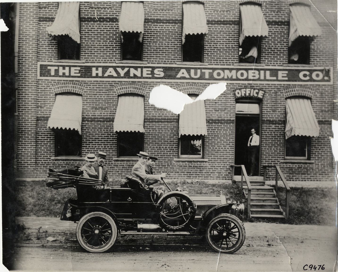 Favorite this☆ Motorists in 1908 Haynes automobile Description: View of four men in 1908 Haynes car, parked in front of the Haynes Automobile Co. office building. Handwritten on back: "Haynes, 1908, publicity." Details Resource ID: na007662 Subject: Haynes automobile Haynes Automobile Company Photographic prints Date Issued: Unknown year Format: 1 photographic print ; 7.75 x 9.5 in. Member of: National Automotive History Collection Lazarnick Collection Filing Location: Haynes Negative Number: Negative #C9476 Rights: Physical rights are retained by DPL. Copyright is retained in accordance with U.S. copyright laws.