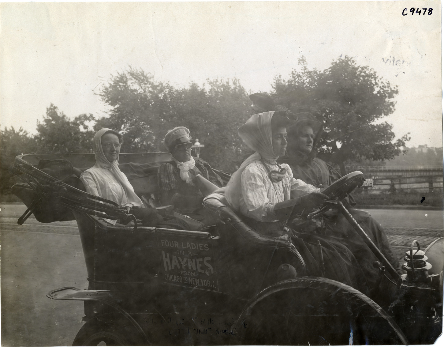 Favorite this☆ Women motorists in 1908 Haynes automobile Description: Close-up view of four women in 1908 Haynes car. "Four ladies in a Haynes from Chicago to New York" sign displayed on side of car. Handwritten on back: "Haynes, 1908." Details Resource ID: na007664 Subject: Haynes automobile Women automobile drivers Photographic prints Date Issued: Unknown year Format: 1 photographic print ; 7.5 x 9.75 in. Member of: National Automotive History Collection Lazarnick Collection Filing Location: Haynes Negative Number: Negative #C9478 Rights: Physical rights are retained by DPL. Copyright is retained in accordance with U.S. copyright laws.