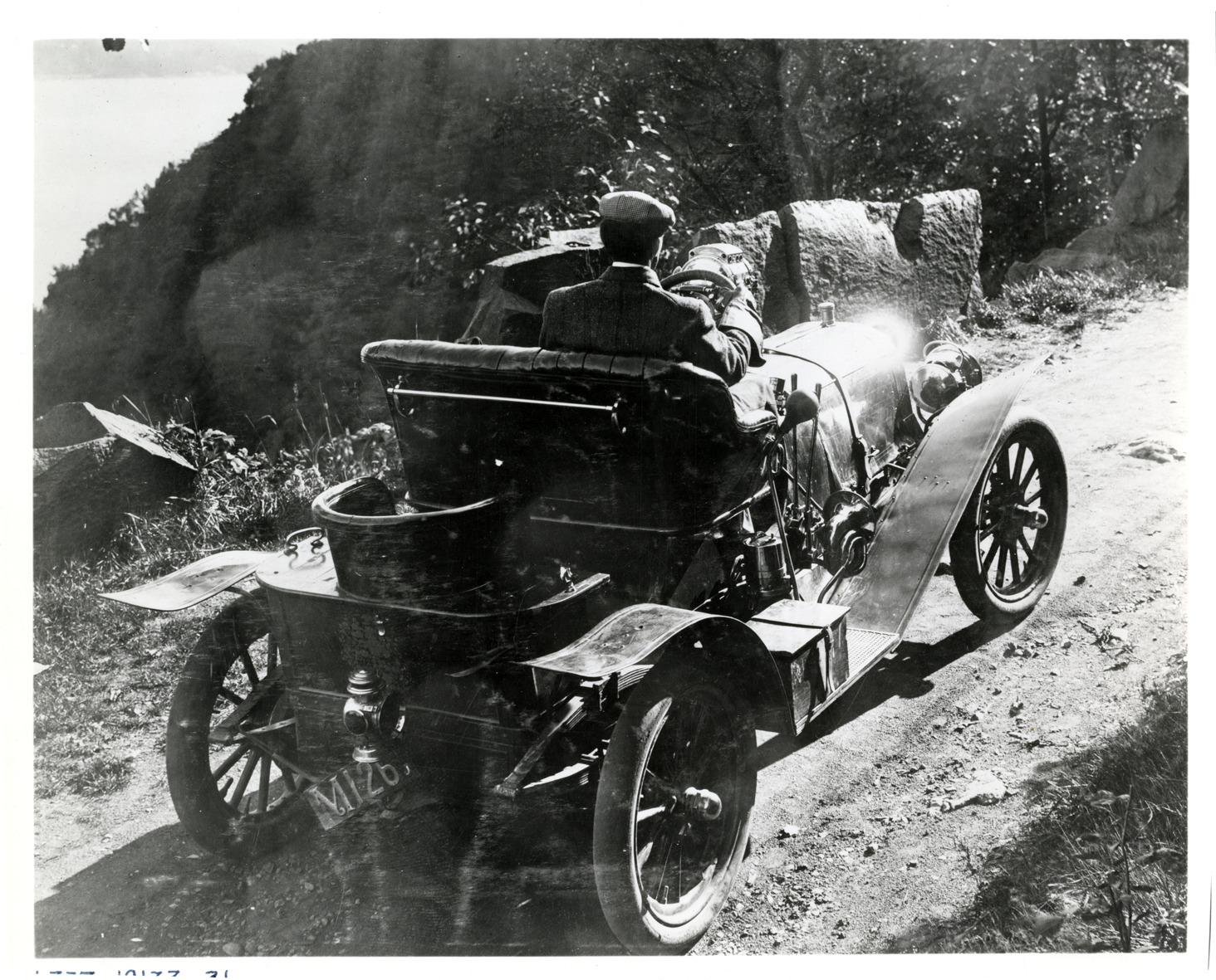 Rear view of man driving Haynes car near the Palisades along the Hudson River. Handwritten on back: "Haynes. Outing near Palisades along the Hudson River, 1907."