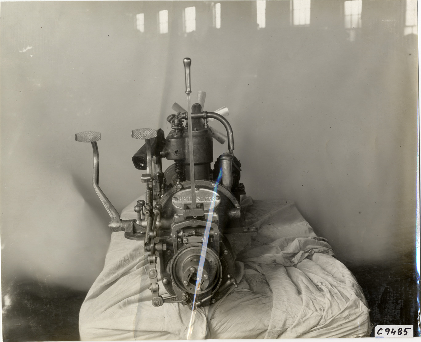 View of 1911 Herreshoff car engine. Handwritten on back: "Herreshoff, 1911."