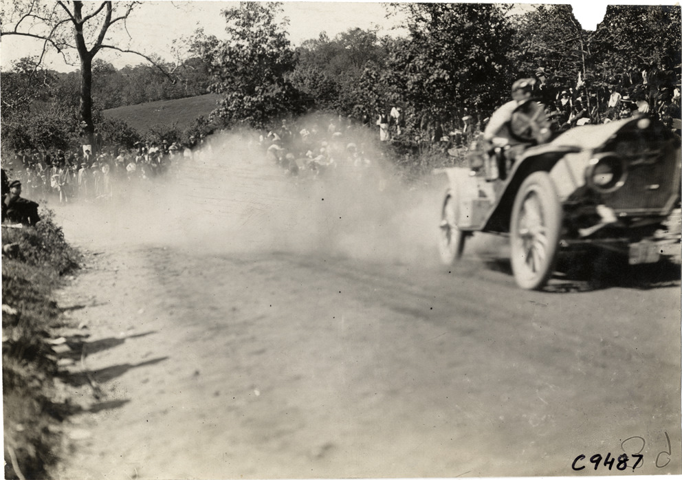 View of Harry Tuttle driving Stoddard-Dayton car no. 17 in 1909 Bridgeport Hill Climb at Sport Hill, Connecticut. Crowd watches from sidelines. Handwritten on back: "Hill Climbs--Bridgeport Hill Climb, 1909. 5/31/09 Sport Hill. Stoddard-Dayton #17, Harry Tuttle."