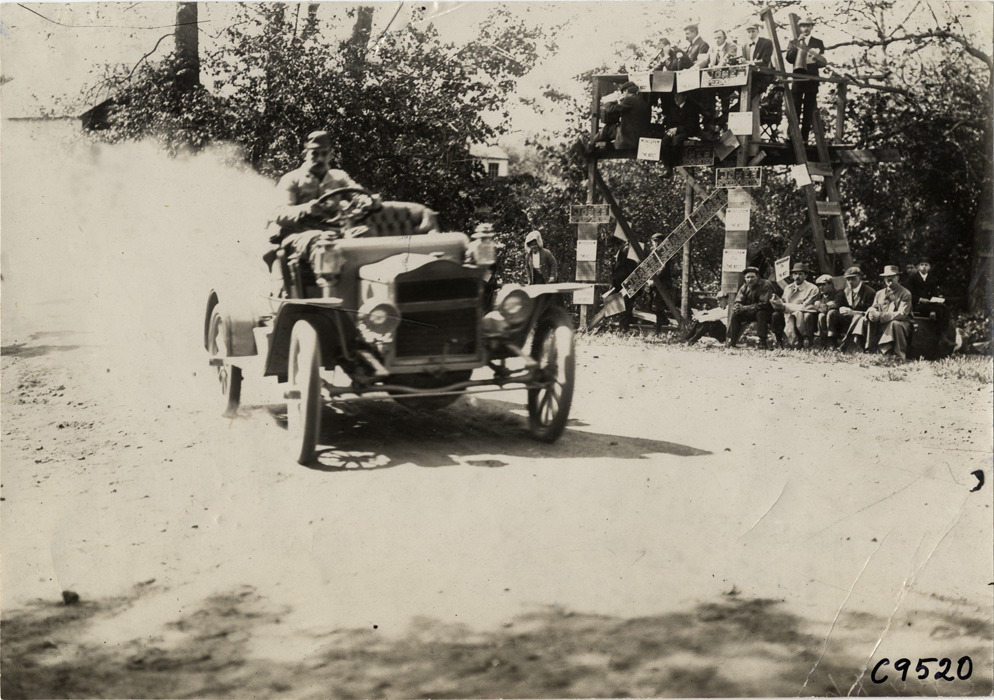 Driver in racecar, 1909 Bridgeport Hill Climb at Sport Hill, Connecticut