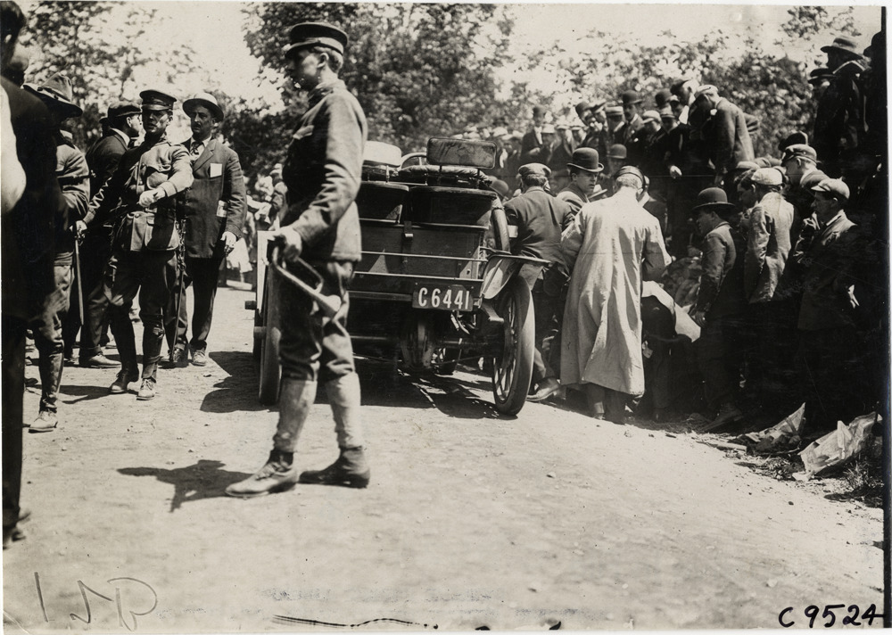 View of Red Cross car and doctors attending to injured spectators after accident at 1909 Bridgeport Hill Climb at Sport Hill, Connecticut. Stamped on back: "Spooner & Wells, Inc., photographers, telephones 3472-3473 Columbus, 1931 Broadway, New York." Handwritten on back: "Hill Climbs--Bridgeport Hill Climb, 1909. 5/31/09 Sport Hill. Red Cross car."