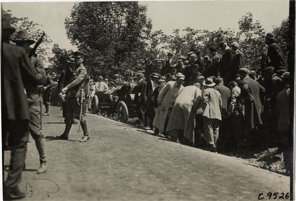 View of doctors attending to injured spectators on side of road after accident at 1909 Bridgeport Hill Climb at Sport Hill, Connecticut. Uniformed man stands in center of road; car on side of road. Stamped on back: "Spooner & Wells, Inc., photographers, telephones 3472-3473 Columbus, 1931 Broadway, New York." Handwritten on back: "Hill Climbs--Bridgeport Hill Climb, 1909. 5/31/09 Sport Hill."