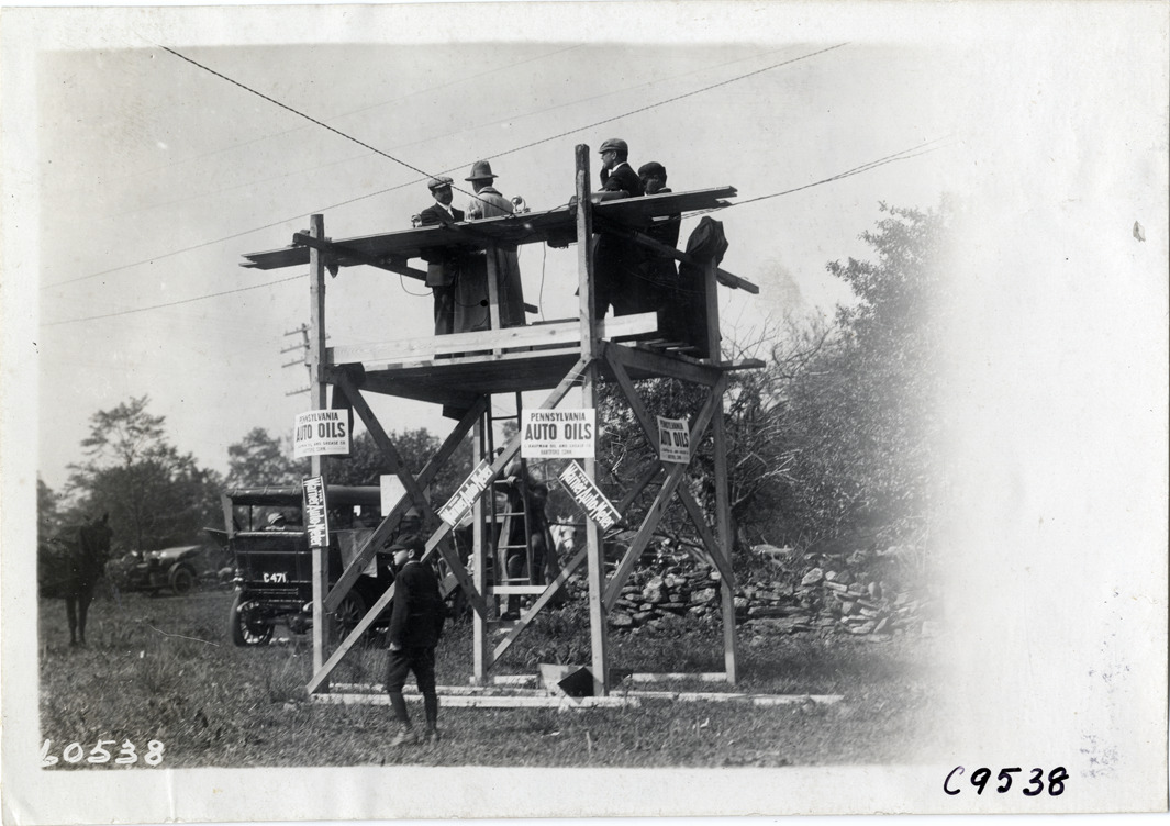 View of several men on reviewing stand at 1910 Bridgeport Hill Climb at Sport Hill, Connecticut. Advertisements for Pennsylvania Auto Oils and Warner Auto-Meter attached to stand; car in background. Stamped on back: "Spooner & Wells, Inc., photographers, telephones 3472-3473 Columbus, 1931 Broadway, New York." Handwritten on back: "Hill Climbs--Bridgeport Hill Climb, Conn., 1910."