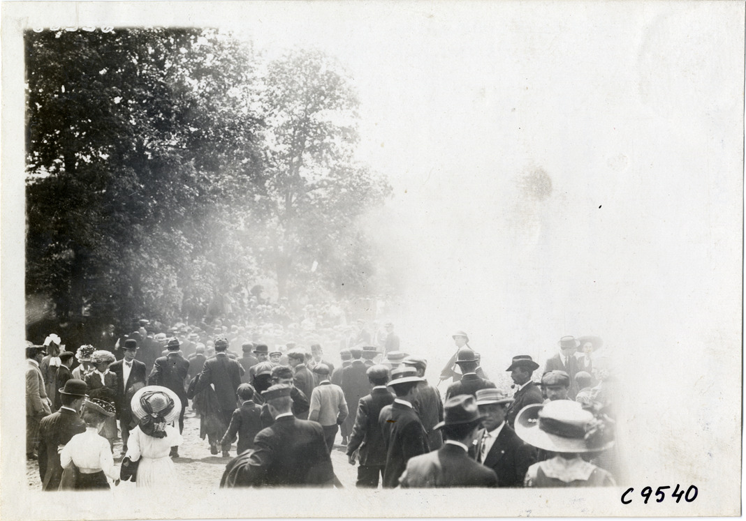 View of spectators at 1910 Bridgeport Hill Climb at Sport Hill, Connecticut. Stamped on back: "Spooner & Wells, Inc., photographers, telephones 3472-3473 Columbus, 1931 Broadway, New York." Handwritten on back: "Hill Climbs--Bridgeport Hill Climb, Conn., 1910."