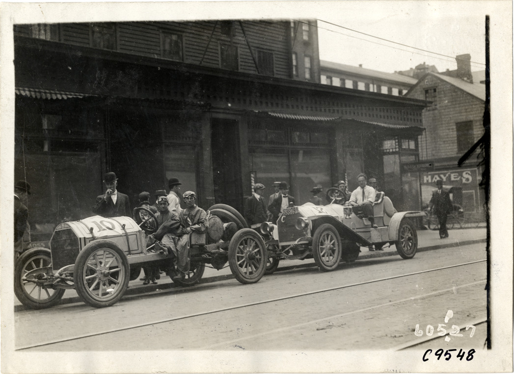 View of drivers in two racecars, parked in front of storefronts, at 1910 Bridgeport Hill Climb at Sport Hill, Connecticut. Stamped on back: "Spooner & Wells, Inc., photographers, telephones 3472-3473 Columbus, 1931 Broadway, New York." Handwritten on back: "Hill Climbs--Bridgeport Hill Climb, Conn., 1910."