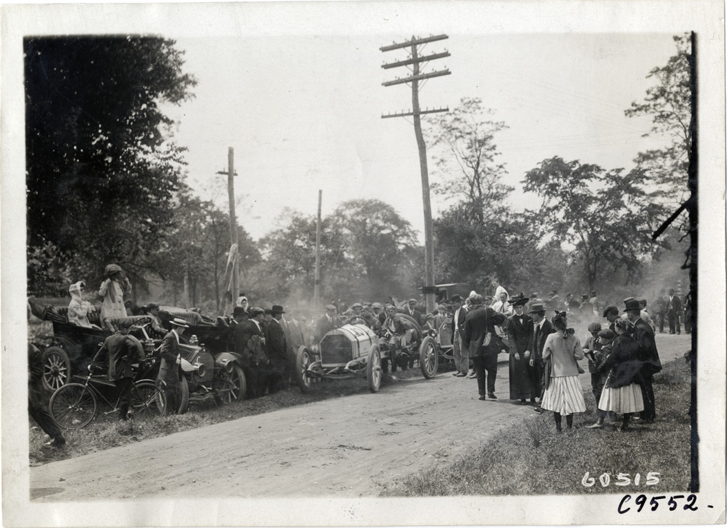 View of spectators and cars at 1910 Bridgeport Hill Climb at Sport Hill, Connecticut. Stamped on back: "Spooner & Wells, Inc., photographers, telephones 3472-3473 Columbus, 1931 Broadway, New York." Handwritten on back: "Hill Climbs--Bridgeport Hill Climb, Conn., 1910."