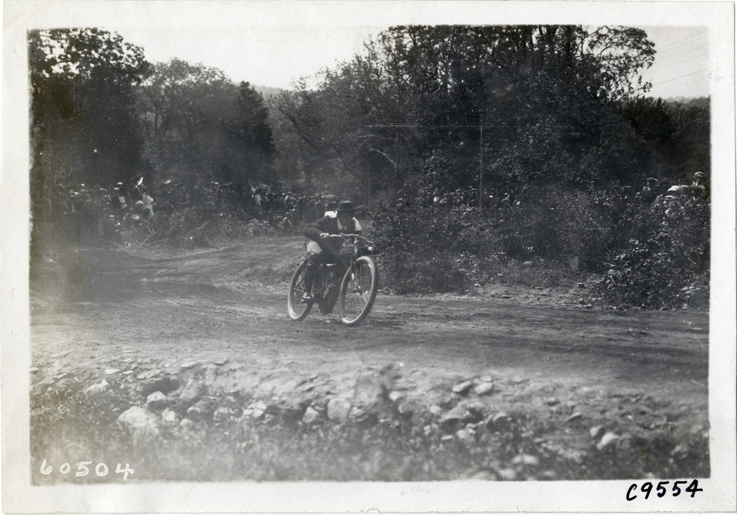 Man racing motorcycle, 1910 Bridgeport Hill Climb at Sport Hill, Connecticut